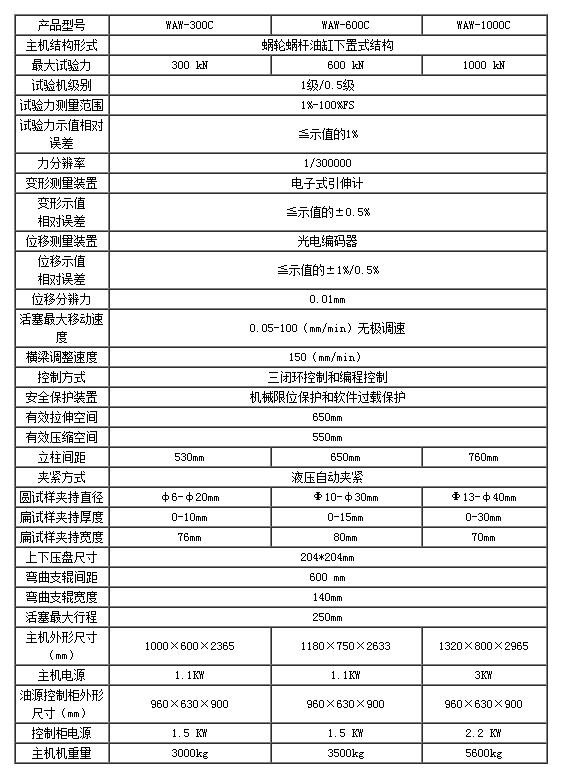 WAW-C系列微機控制電液伺服萬能試驗機由蝸輪蝸桿下置式主機及琴式油源控制柜組成,油泵采用意大利馬祖奇進口低噪音高性能齒輪泵。拉伸空間位于主機上方,壓縮、彎曲試驗位于主機下方即中橫梁和工作臺之間。試驗空間的調整通過移動中橫梁來實現,中橫梁升降采用蝸輪蝸桿傳動。計算機全自動閉環控制高性能電液伺服閥完成對各種材料的拉伸、壓縮、彎曲等試驗。試驗結束后自動采取材料的FM、REH、REL、RPO.2、RP1、RM和彈性模量E等實驗結果。
